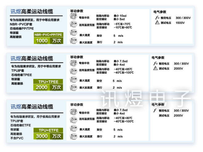訊煜電子的高柔運(yùn)動(dòng)線纜按“運(yùn)動(dòng)次數(shù)”可分為: 1000萬次、2000萬次和 3000萬次3大類。