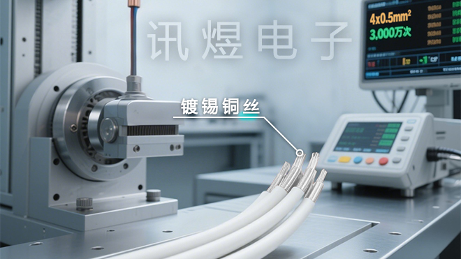 訊煜高柔運(yùn)動(dòng)線纜、潔凈線纜、真空線纜,這些線纜能彎折2000~3000萬次不斷芯、穩(wěn)定運(yùn)行,核心就在線纜內(nèi)部那一根根多股精細(xì)抗氧化鍍錫銅絲。比如:4x0.5 mm2、 3000萬次的高柔運(yùn)動(dòng)線纜,要用到4根截面積為0.5 mm2的單芯線,每根芯線導(dǎo)體選用的是抗氧化鍍錫銅(鍍錫銅更耐用、更柔軟、耐腐蝕性、抗氧化及信號傳導(dǎo)性更強(qiáng))。 先把14根直徑0.08mm的細(xì)銅絲合絞為一組,然后再用7組合絞后的銅絲進(jìn)行復(fù)絞,相當(dāng)于把98根超細(xì)銅絲像麻花辮一樣緊密交織。 復(fù)絞結(jié)構(gòu)不僅讓芯線更加牢固,也讓銅絲間的應(yīng)力均勻分散,即使經(jīng)過數(shù)千萬次彎折,銅絲的導(dǎo)電性能依舊穩(wěn)定可靠!