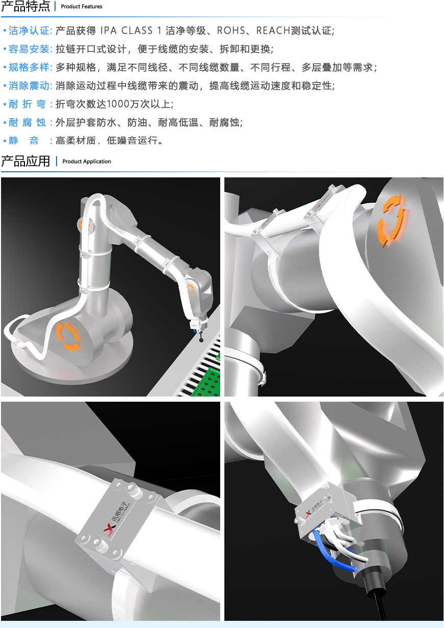 訊煜開放易安裝式機器人無塵管線包,耐折彎達1000萬次以上。高分子材料柔性線卡,很好地包裹和保護線纜、減小磨損。開放式拉鏈護套,安裝、維護便捷。產品潔凈等級達IPA CLASS 1,滿足無塵環(huán)境下工業(yè)機器人的穩(wěn)定、可靠運行。提供多種規(guī)格,滿足不同線徑、線纜數(shù)量需求。